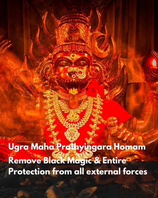 MAHA PRATHYANGIRA Homam is more powerful by performing big homa kundam with more priests, and the mantra chanting count level is higher, and the quantity of black pepper and red chilli used in this homam is also high to remove the hardest evil spirits, black magic, and powerful enemies. (This includes flowers, pooja materials , Pooja Prasadam) ( Dakshina & Cloths extra)