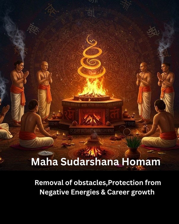 The Sudarshana Homam is a powerful ritual deeply rooted in Hindu traditions, centered around the divine weapon of Lord Vishnu known as the Sudarshana Chakra. This sacred ceremony has an influence on devotees seeking protection, purification, and spiritual growth.. The Sudarshana Chakra is not merely a weapon but a manifestation of divine energy. It is said to possess the ability to dispel ignorance, remove obstacles, and grant protection to devotees. The Sudarshana Homam harnesses this power, invoking the blessings of Lord Sudarshana to bring about positive transformations in one’s life. Devotees believe that performing this homam can help overcome challenges, ward off negative energies, and promote spiritual well-being. (This includes flowers, pooja materials ,Dakshina & Pooja Prasadam)