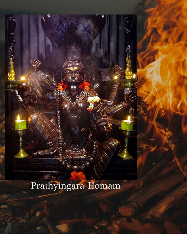 Prathyangira Devi is a powerful manifestation of divine energy, often depicted as a half-human, half-lion figure, symbolizing the balance of good and evil.. The primary purpose of this homam is to nullify the effects of curses, witchcraft, evil spirits, and black magic. Dried red chilies and pepper are central ingredients used in the homam. Pratyangira homam provides numerous benefits, including protection from negative energies, evil spirits, black magic, and powerful enemies; removal of obstacles in personal and professional life; enhancement of courage, self-confidence, and clarity of thought; and relief from physical and mental illnesses and curses. (This includes flowers, pooja materials , Pooja Prasadam) ( Dakshina & Cloths extra)