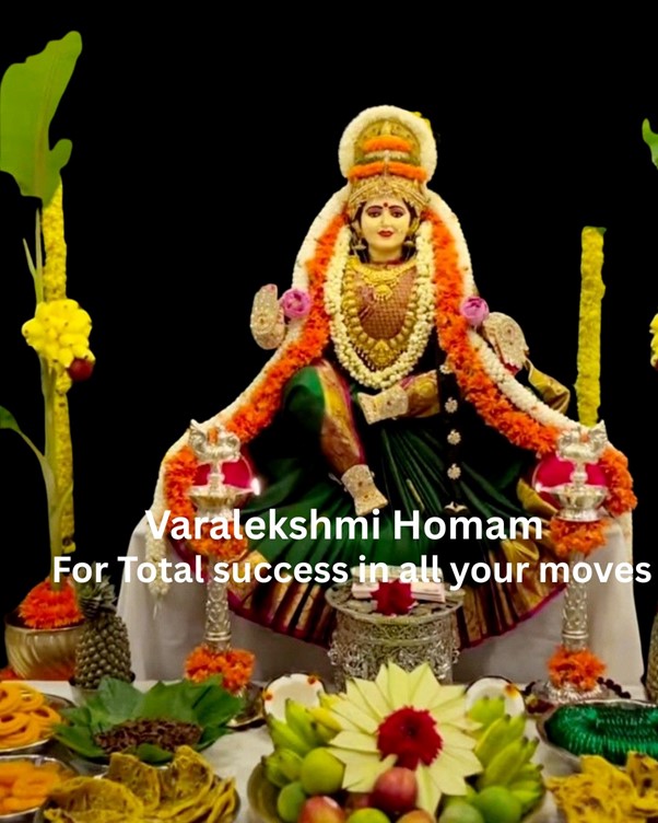 Varalakshmi puja and Homam is performed to remove obstacles from the path of success. It solves financial woes and ensures that you get the blessings of eight forms of Mahalakshmi. Women can perform this ritual for the long life of their husbands with the blessings of Goddess Varalakshmi. Vedic literature says that worshipping Goddess Maha Lakshmi on Varalakshmivratham day is equivalent to worshipping her eight energies or forms namely Sri Lakshmi (Goddess of wealth), Bhu Lakshmi (Goddess of Earth), Saraswati (Goddess of Learning), Priti Lakshmi (Goddess of Love), Kirti Lakshmi (Goddess of Fame), Shanti Lakshmi (Goddess of Peace), Santushti Lakshmi (Goddess of Pleasure) and Pushti Lakshmi (Goddess of Strength). The goddess consort Lord Maha Vishnu radiates these energies while doing the duty of preservation. These abstract forces and their duties are beyond the understanding of common man and therefore they are worshipped as eight forms forreceiving three basic boons of wealth, health and prosperity which are the main requirements of mankind.